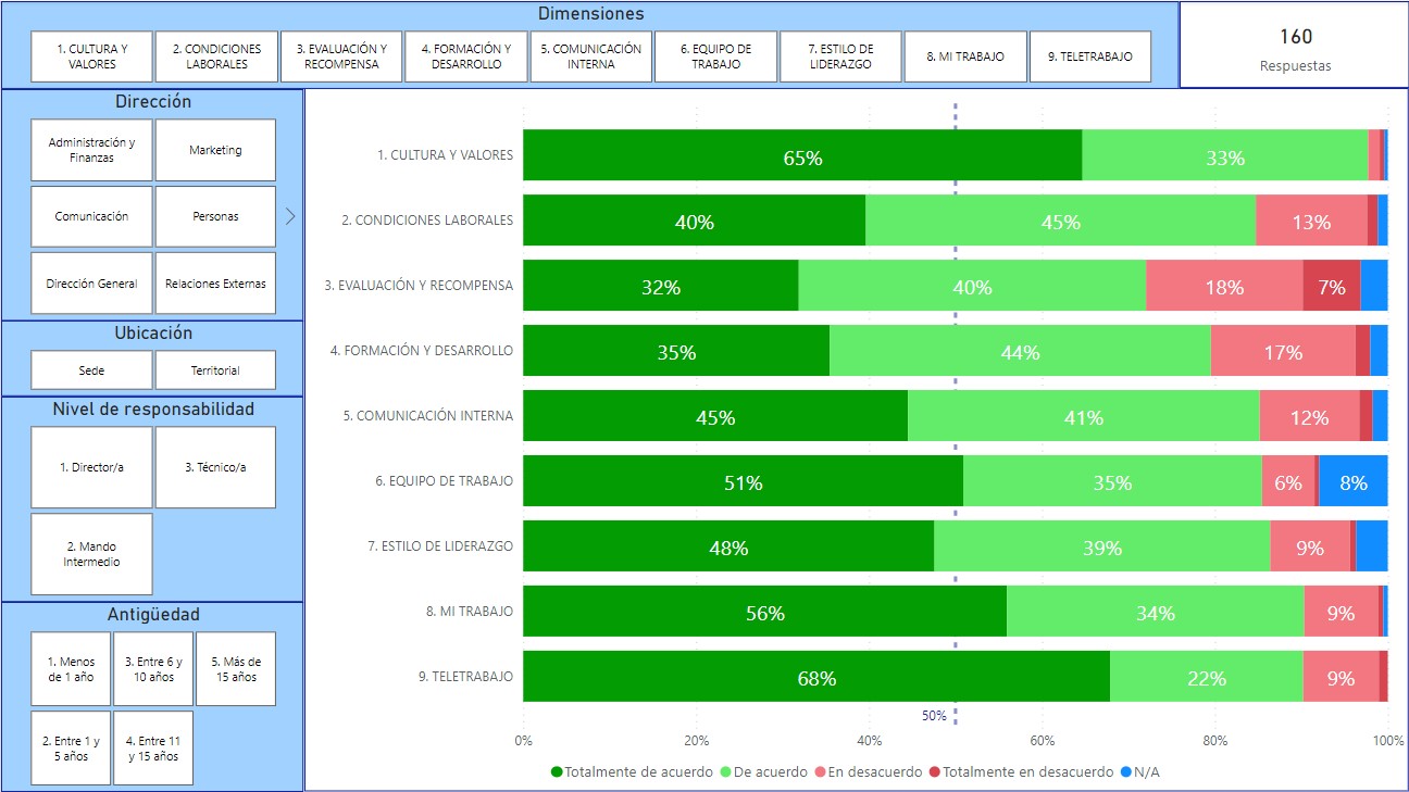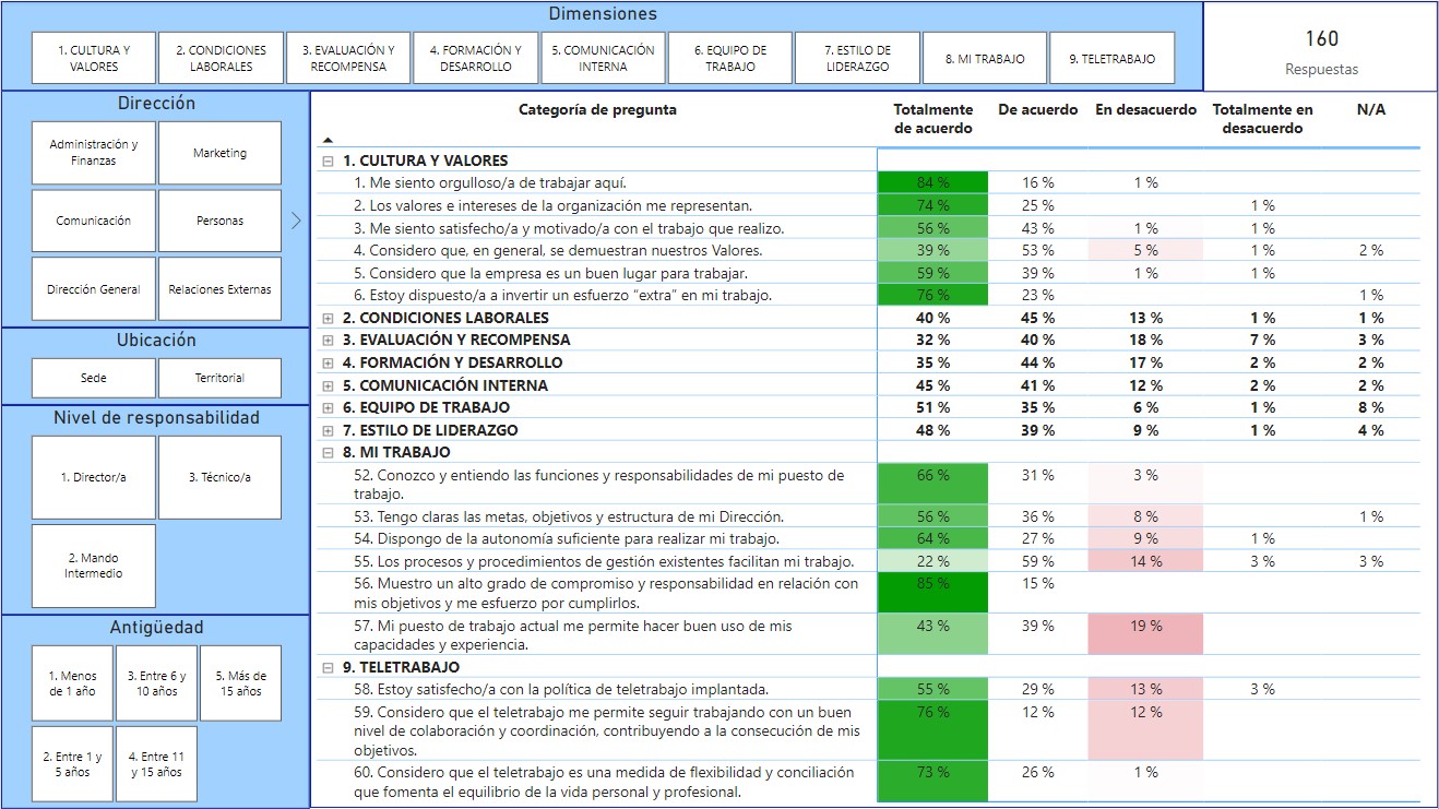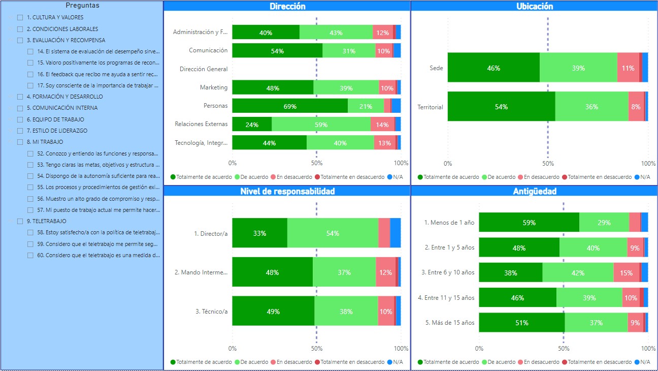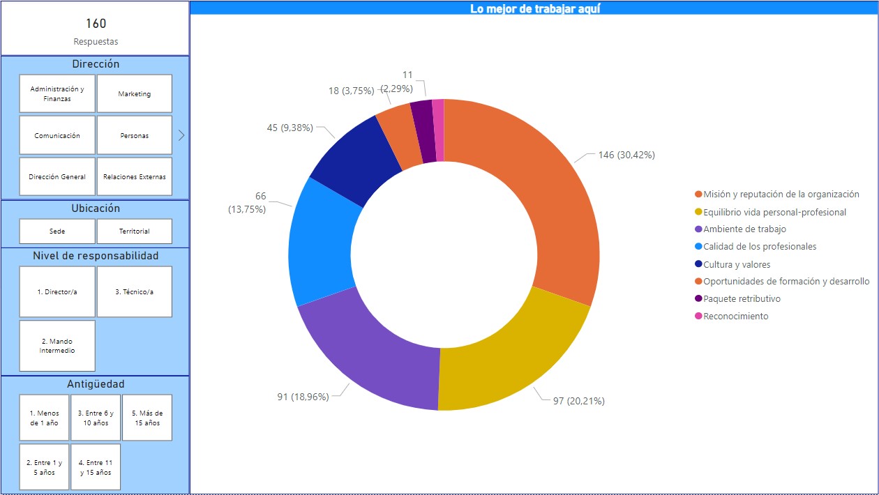 Estas, y otras preguntas , pueden ser analizadas realizando encuestas a la plantilla que precargan información adicional de las personas, y que es desvinculada de su identificación en el momento de contestar, asegurando anonimato de las respuestas.